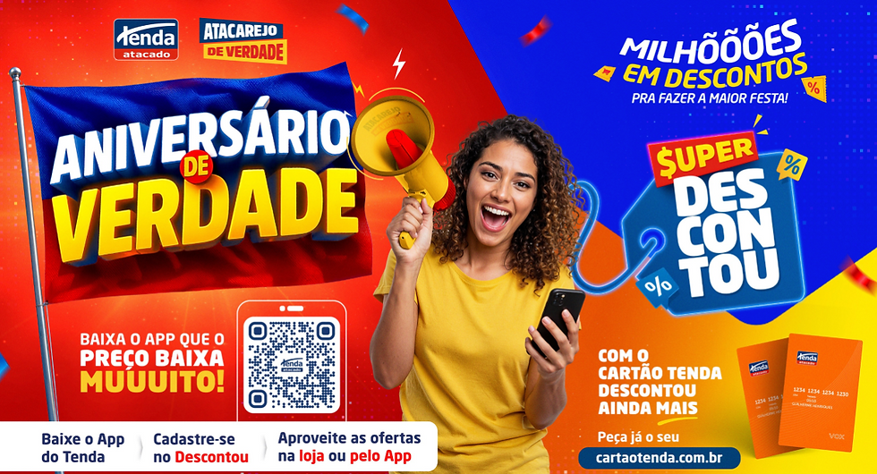 Pra celebrar o aniversário, o TENDA resolveu oferecer MILHÕES EM DESCONTOS pra todos no lugar de privilegiar alguns sortudos.