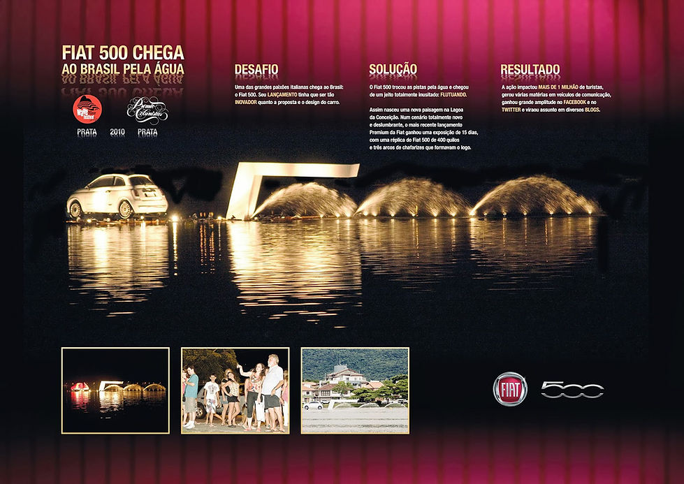 Assim nasceu uma nova paisagem na Lagoa da Conceição. Num cenário totalmente novo e deslumbrante, o mais recente lançamento Premium da Fiat ganhou uma exposição de 15 dias, com uma réplica do Fiat 500 de 400 quilos e três arcos de chafarizes que formavam o logo